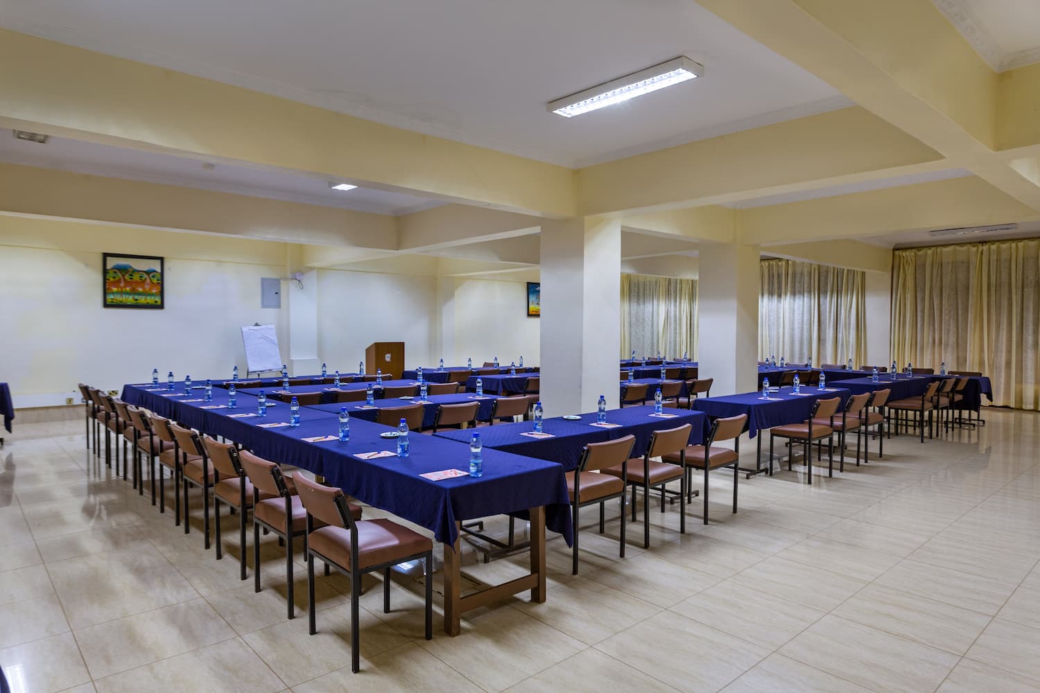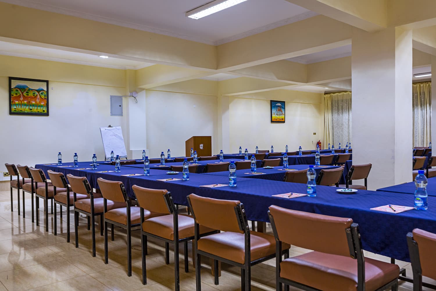 Adorned with beautiful African art meticulously displayed on its walls, the conference room showcases the rich cultural heritage of the region through the art pieces. The tastefully chosen leather chairs provide not only comfort but also add a touch of elegance to the ambiance.