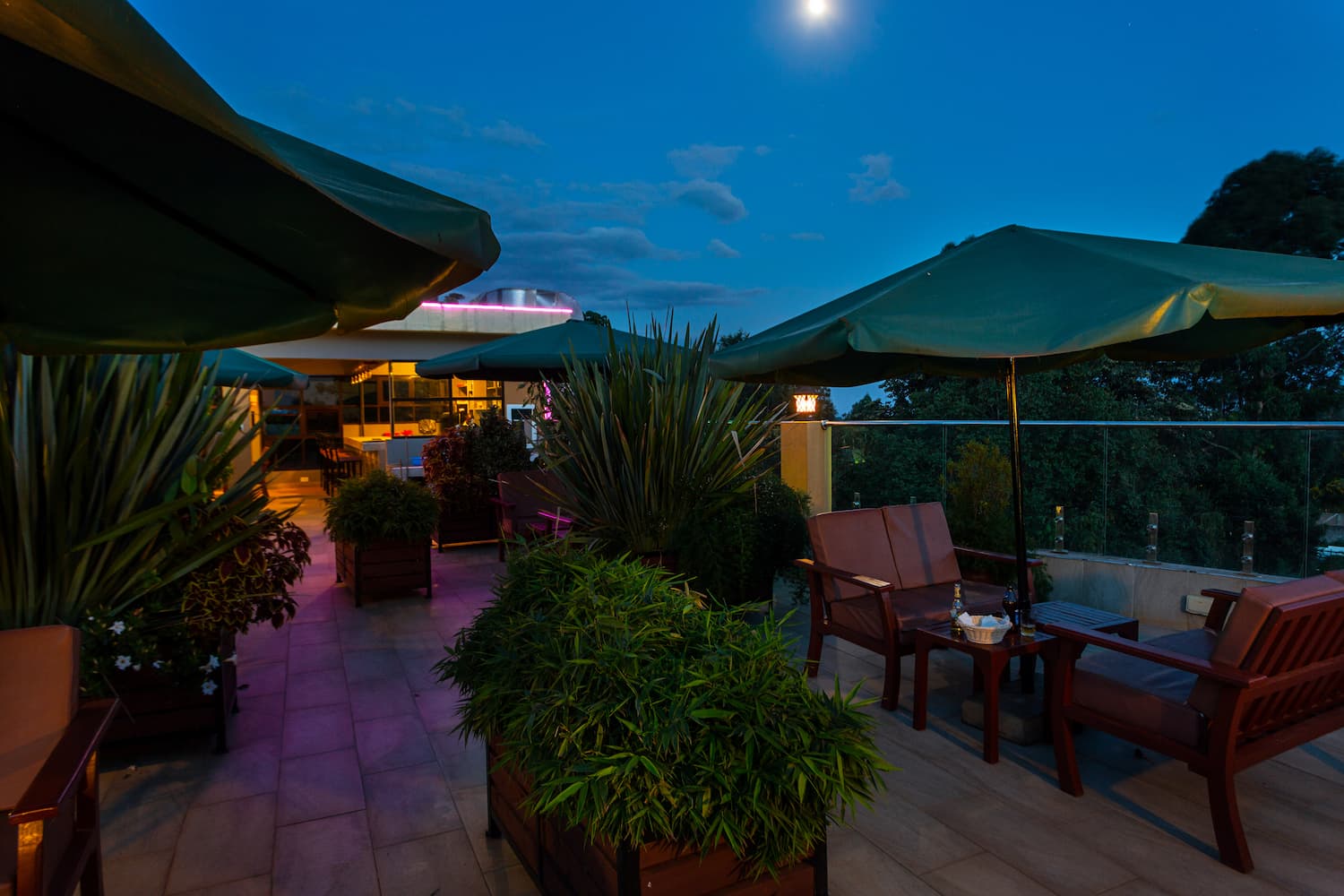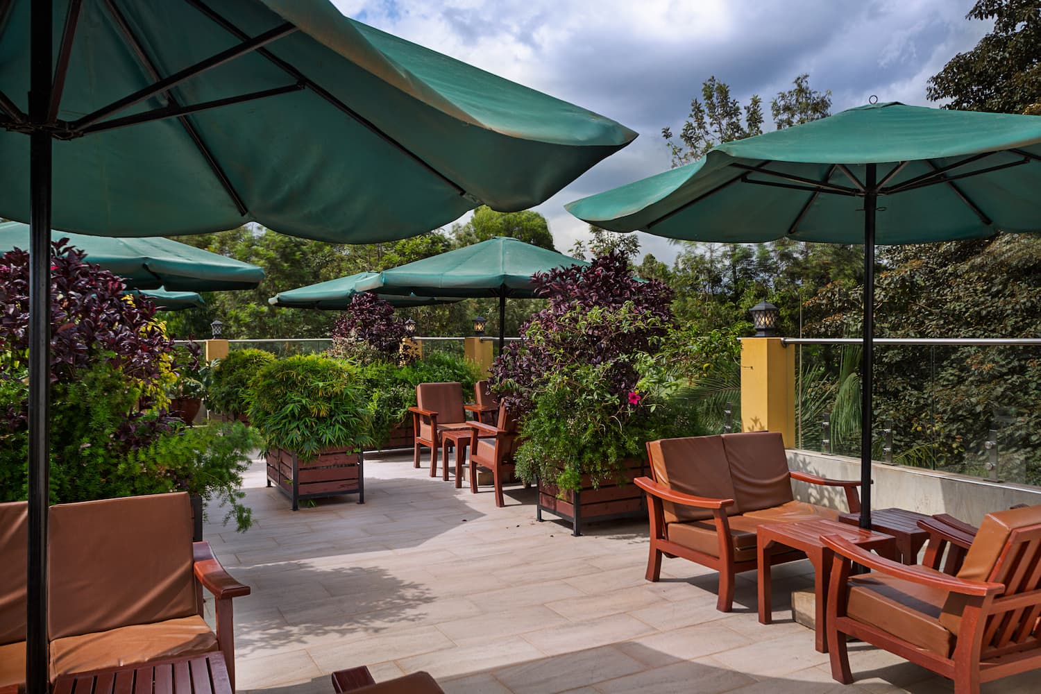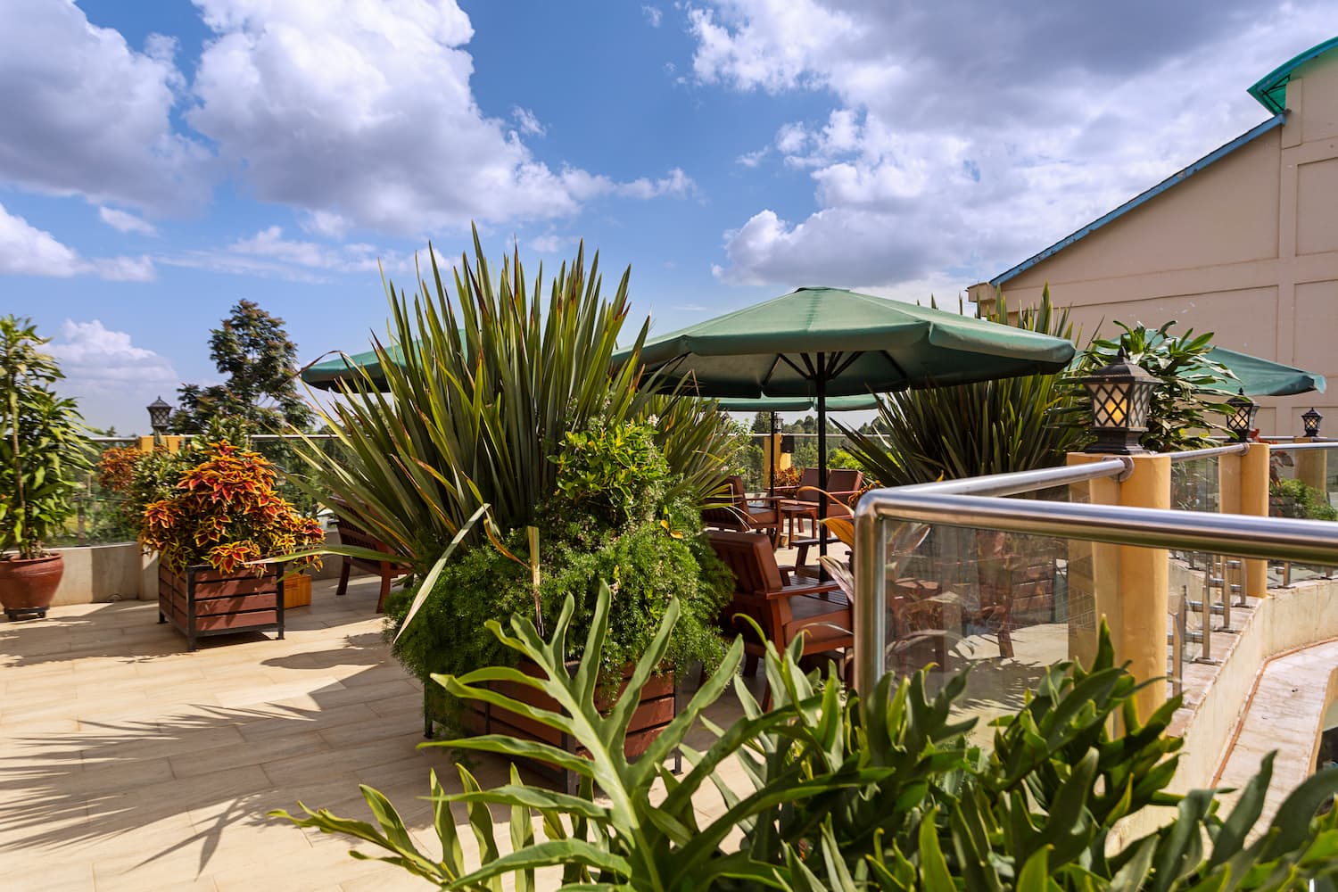 Welcome to our exquisite sky lounge, where sophistication meets nature's beauty. As you step onto our elegant terrace, you'll be captivated by the mesmerizing views of lush trees and meticulously crafted landscaping. As you dine, the serene ambiance embraces you with a sense of tranquility and natural beauty. Our elegant parasols provide a touch of refinement, offering shade and enhancing the overall charm of the setting.
