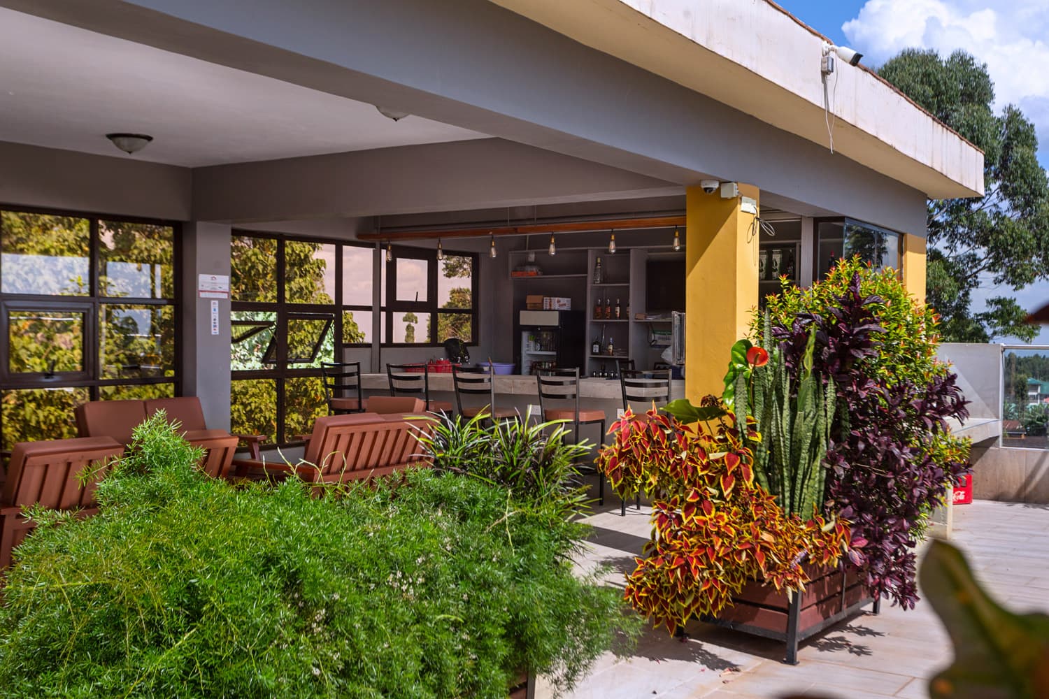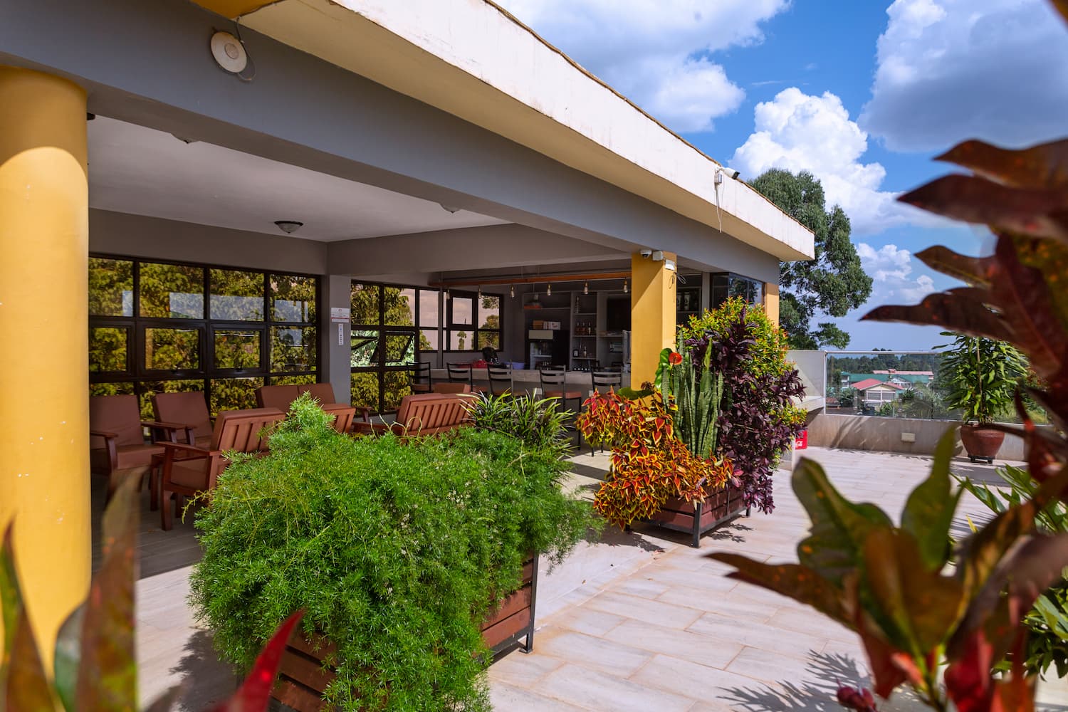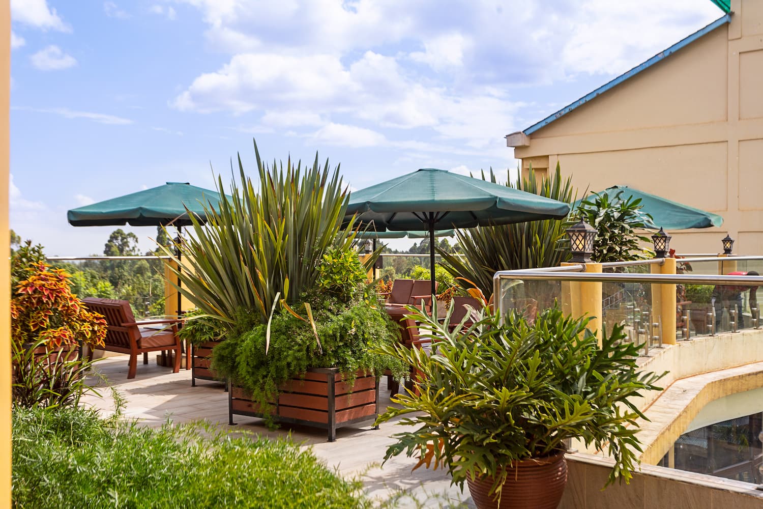 Welcome to our exquisite sky lounge, where sophistication meets nature's beauty. As you step onto our elegant terrace, you'll be captivated by the mesmerizing views of lush trees and meticulously crafted landscaping. As you dine, the serene ambiance embraces you with a sense of tranquility and natural beauty. Our elegant parasols provide a touch of refinement, offering shade and enhancing the overall charm of the setting.